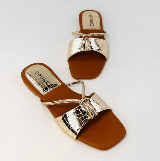 Metallic Croc-Embossed Twist Strap flat Sandals