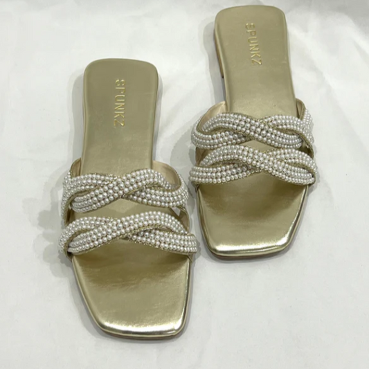 Elegant Pearl & Gold Braided Flat Slipper