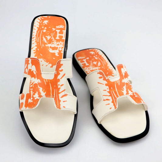 H Strap Tie Dye Leather Non Slip Flat Women Slippers H-10387