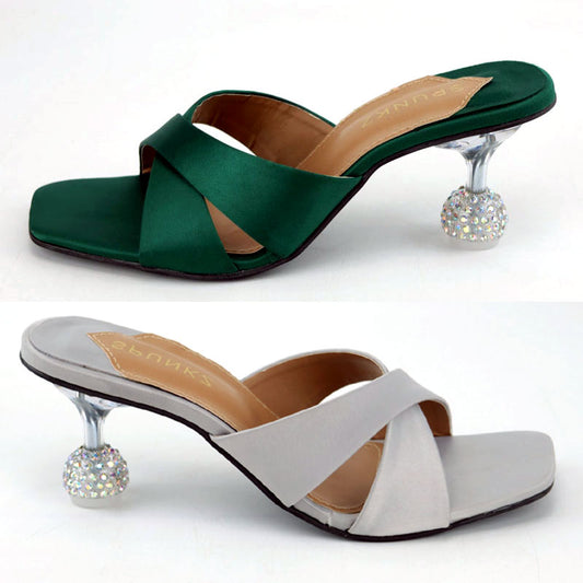 Women Satin Cross Strap Patent Leather Crystal Ball Heels
