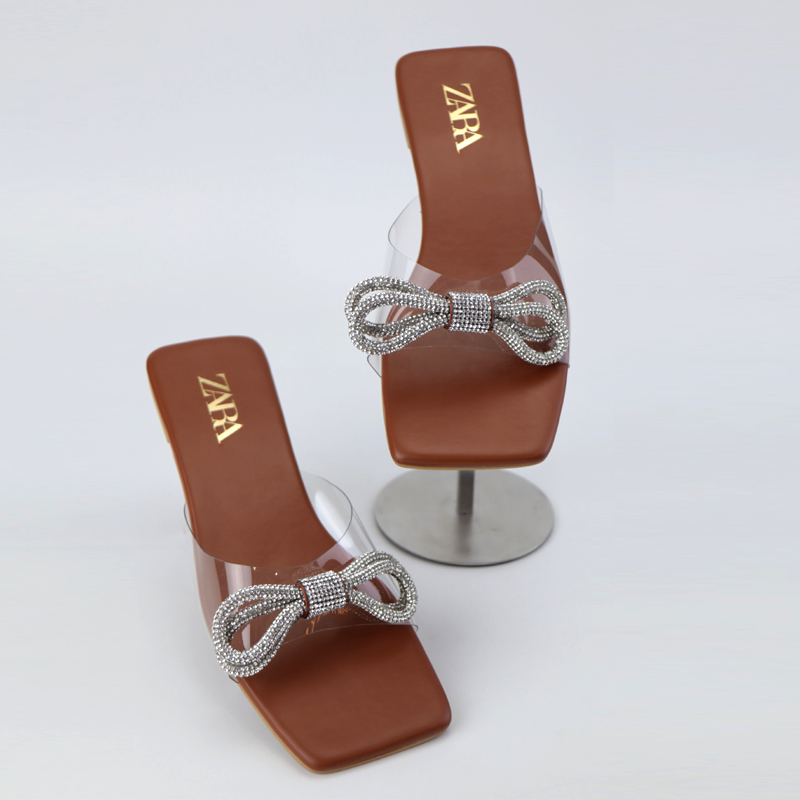Transparent Rhinestone Bow Square Toe Flat Slippers #15642
